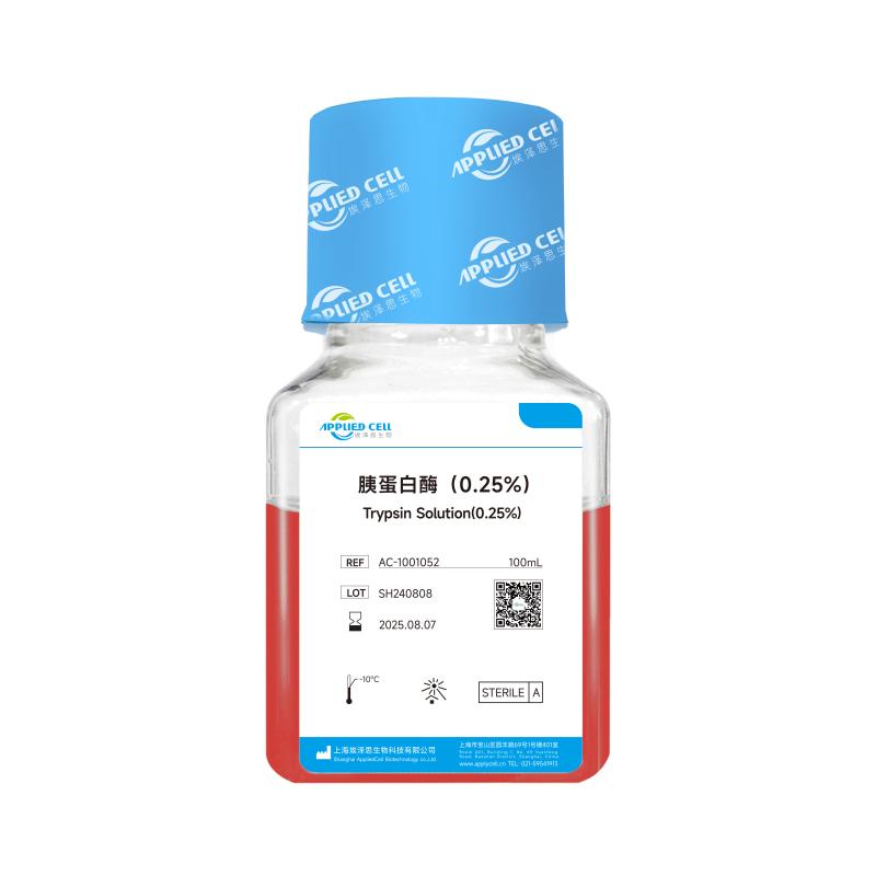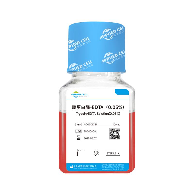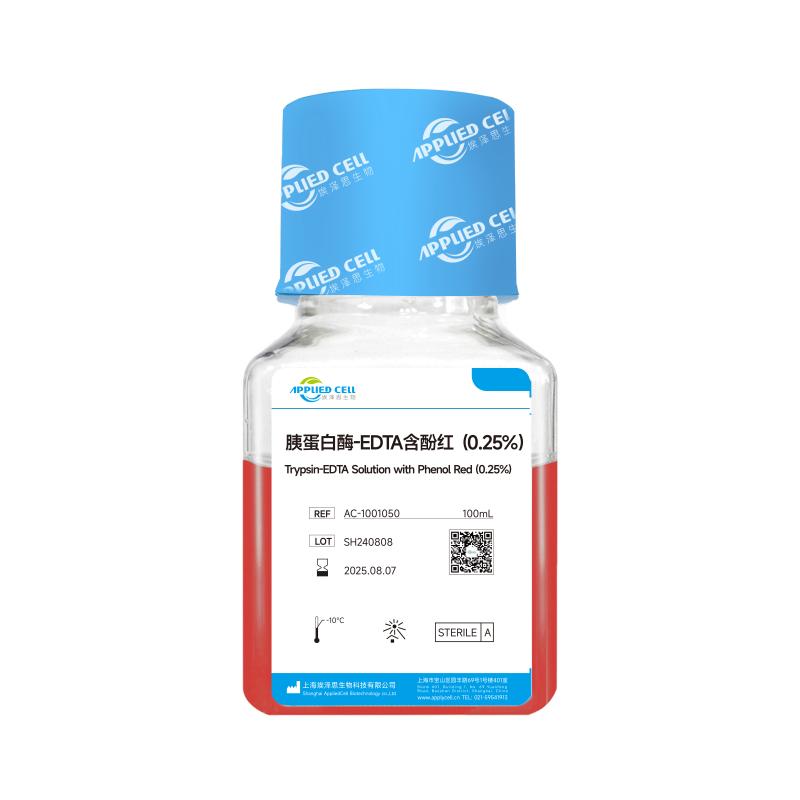 胰蛋白酶-EDTA(0.25%)是埃泽思生物(AppliedCell®)推出的一款溶于无钙镁平衡盐溶液,经过滤除菌,直接用于培养细胞和组织消化的产品。适用于细胞间的蛋白质(如细胞外基质)水解,使组织或贴壁细胞分散成单个细胞,制成细胞悬液用于进一步实验.